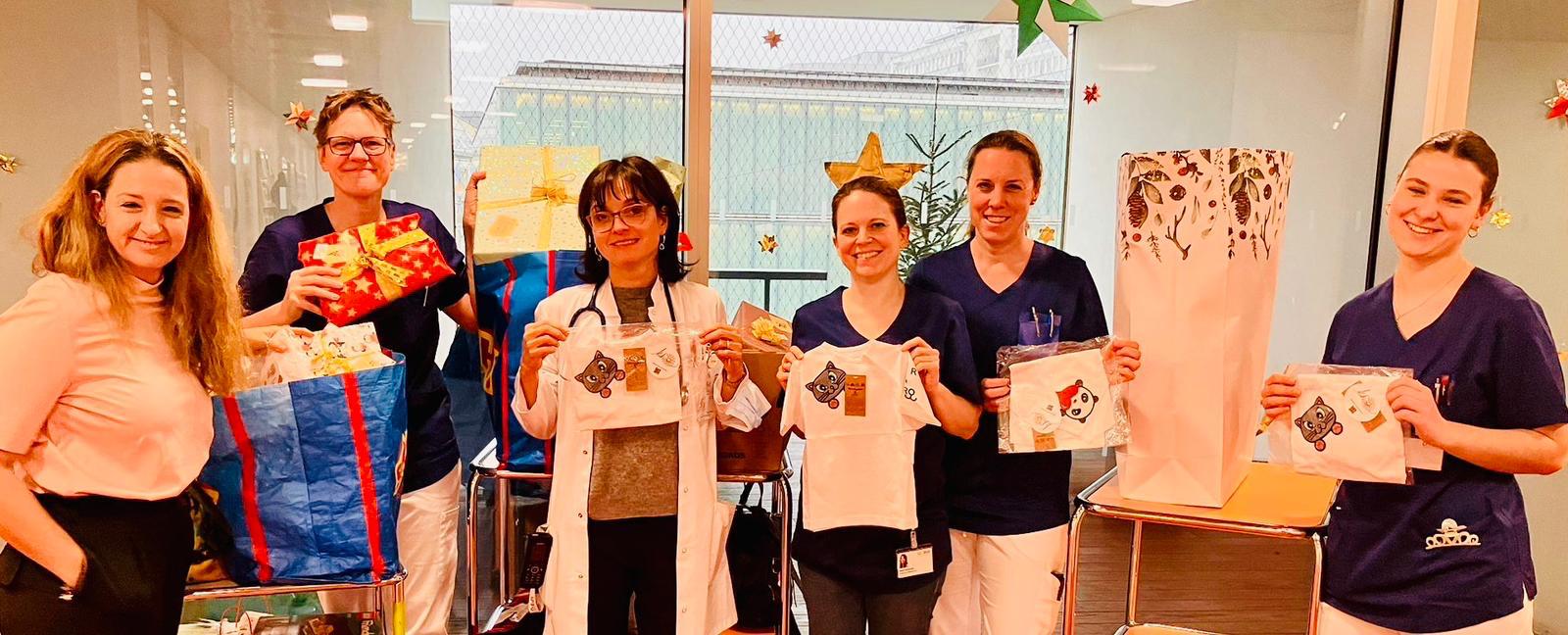 Die Übergabe fand in der Vorweihnachtszeit statt und wurde gemeinsam mit dem Pflegepersonal der Kliniken organisiert. Für uns war es ein herzerwärmender Moment zu sehen, wie positiv die Resonanz vor Ort war. Die Mitarbeitenden der Onkologie-Abteilungen freuten sich sehr über die P-Shirts, da sie ihren kleinen Patienten diesen Komfort bisher nicht anbieten konnten. Jedes Kind, dem wir das Entkleiden und Frösteln vor einer Chemo-Infusion ersparen, erlebt die Therapie ein bisschen angenehmer.